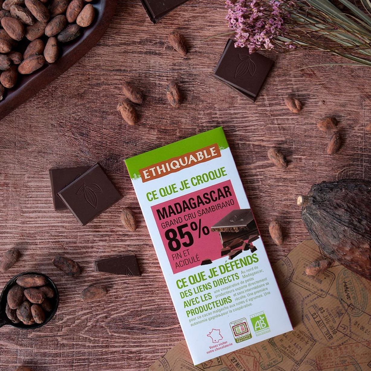Découvrez notre cacao Trinitario rare de la vallée du Sambirano : 85 % de pure intensité, sans amertume, aux arômes acidulés raffinés.
