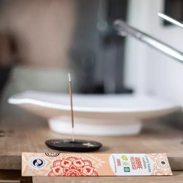 Allumer l’extrémité du bâtonnet d’encens, puis souffler la flamme. Piquer le bâtonnet dans le porte-encens destiné à recevoir la cendre.